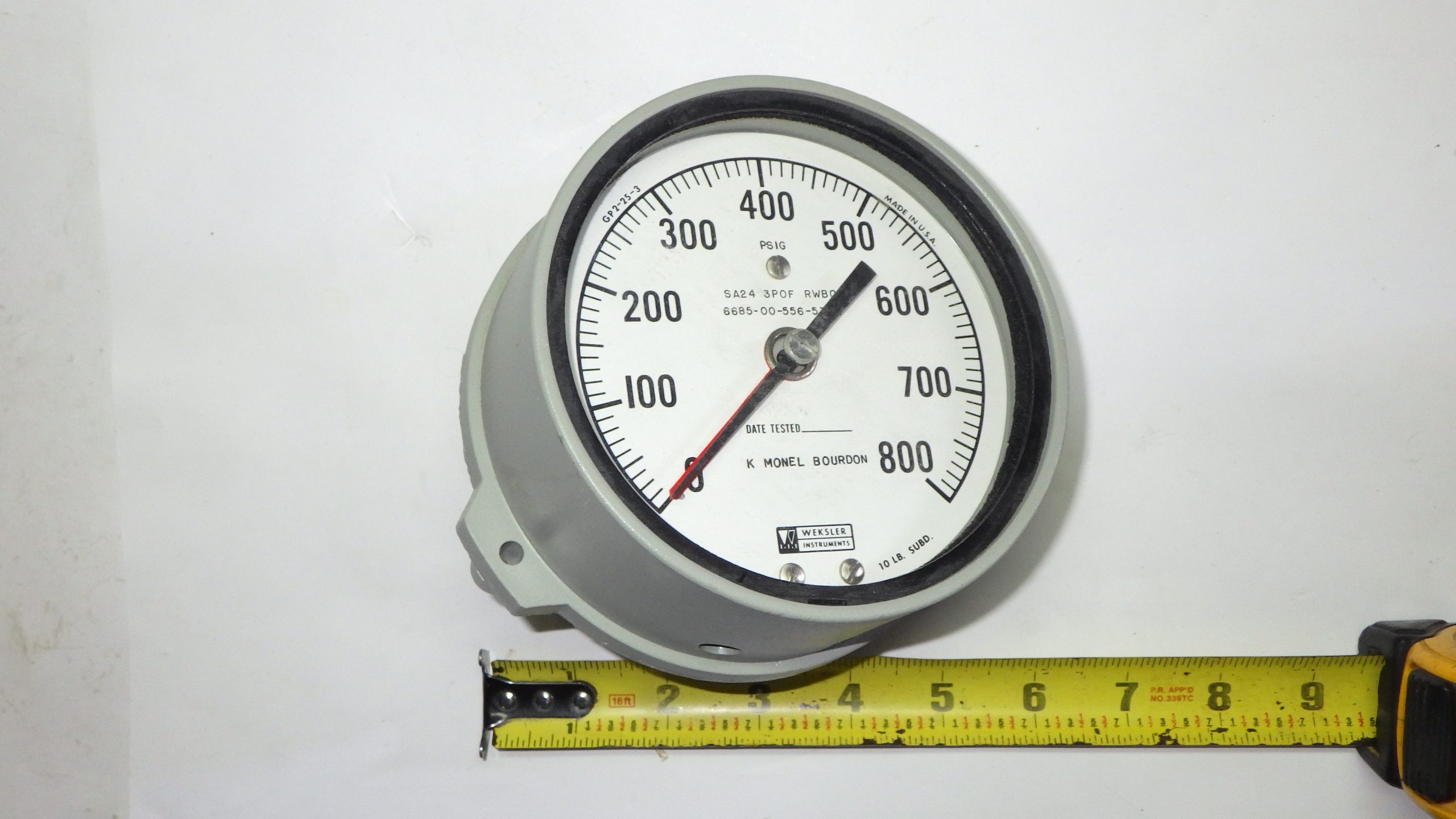 DEFINITION: AN INSTRUMENT DESIGNED TO MEASURE AIR, GAS, FLUID, AND VAPOR PRESSURE BY MEANS OF AN INTERNAL PRESSURE SENSITIVE ELEMENT (BELLOWS, BOURDON TUBE, TRANSDUCER/TRANSMITTER AND THE LIKE) WHICH TRANSMITS ENERGY, BY DIRECT LINKAGE, TO THE INDICATING POINTER OF A SCALE OR A DIGITAL DISPLAY, CALIBRATED IN UNITS OF PRESSURE. IT MAY INCLUDE A TEMPERATURE EQUIVALENT SCALE. FOR ITEMS THAT DO NOT HAVE AN INTERNAL PRESSURE SENSITIVE ELEMENT SEE INDICATOR, PRESSURE.